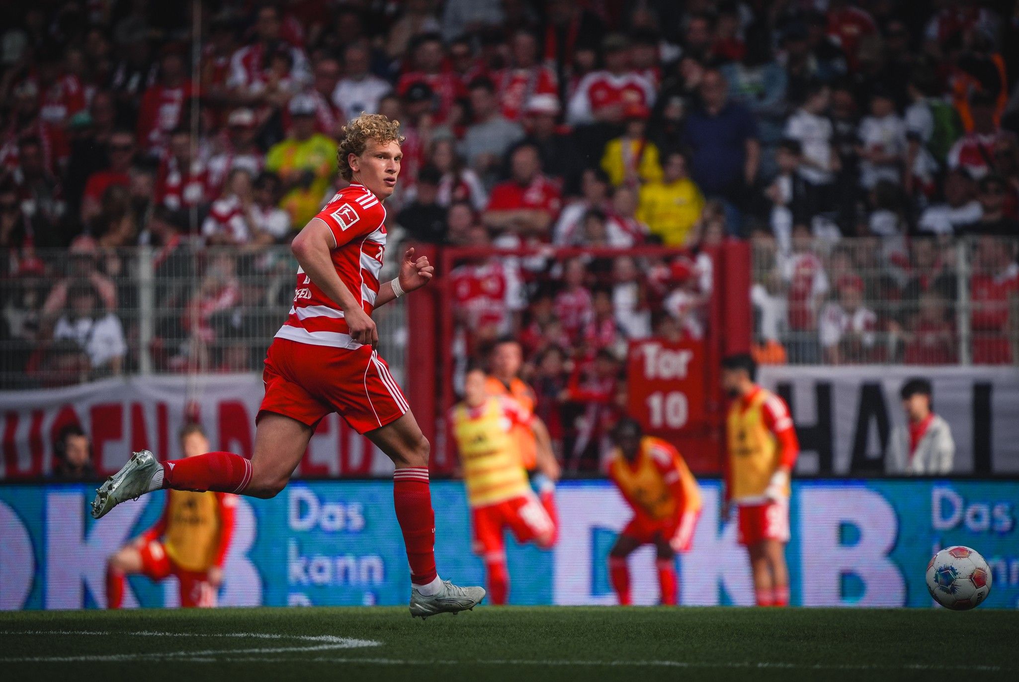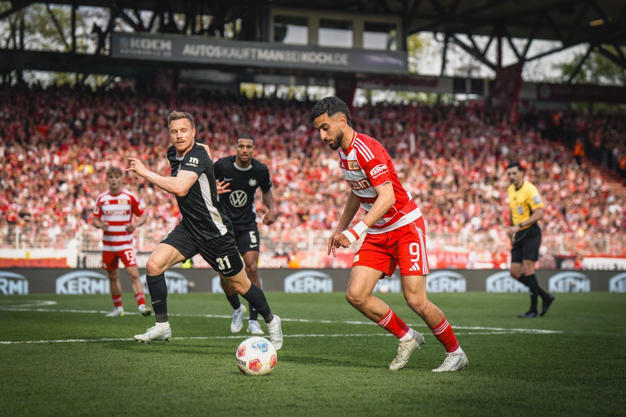 The new boss’s next change came as Andras Schäfer replaced Kemlein in the middle. He was quickly involved, flicking a header away from danger out to Köhn. He then had to chase the substitute Adam Daghin, halfway the length of the pitch as the guests suddenly broke at an Union corner, all in red and white still up in the Wolfsburg half.