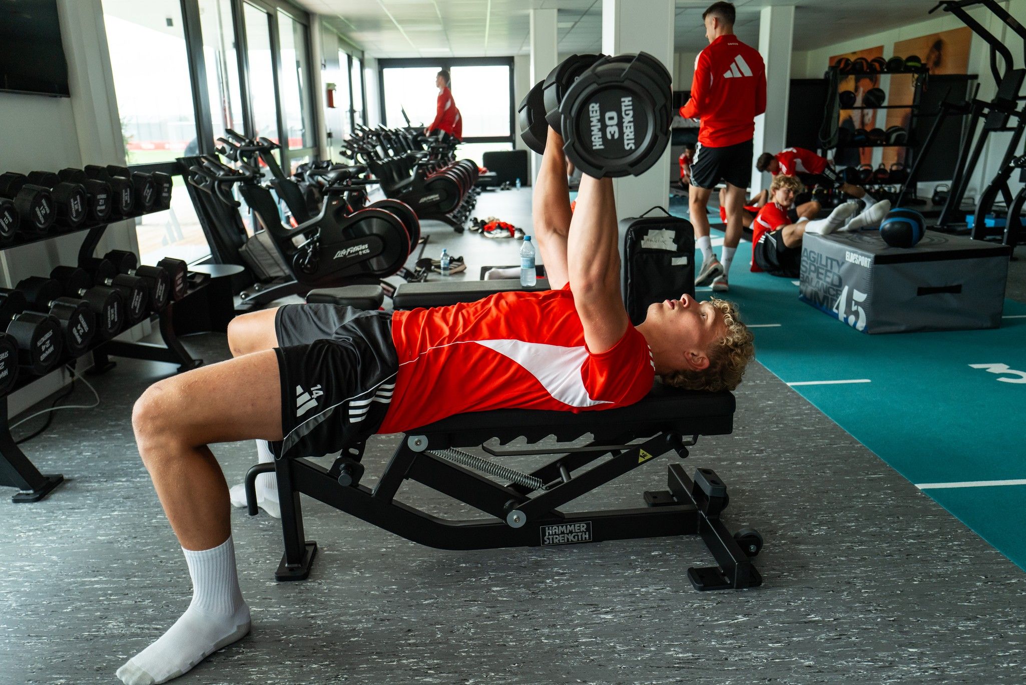At 10:00, Steffen Baumgart calls the team for the first session of the day. After a joint warm-up and passing drills, the focus is on overload situations in attack. They work hard for two hours – intensively, loudly, and with concentration. After training, Leopold Querfeld heads back to the gym. There, he rolls out on the foam roller and does some follow-up work.