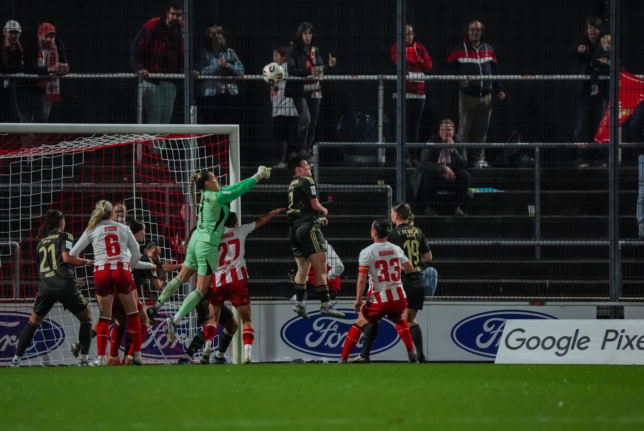 Köln would equalise before the half hour was up. A free kick was lofted in from the left across the box from where Marina Hegering headed it precisely back across goal. The routine looked well-honed, and it worked like a dream. Laura Vogt broke free and arrived at the exact moment to stab it over the line. Cara Bösl was already long taken out of play by the cross.