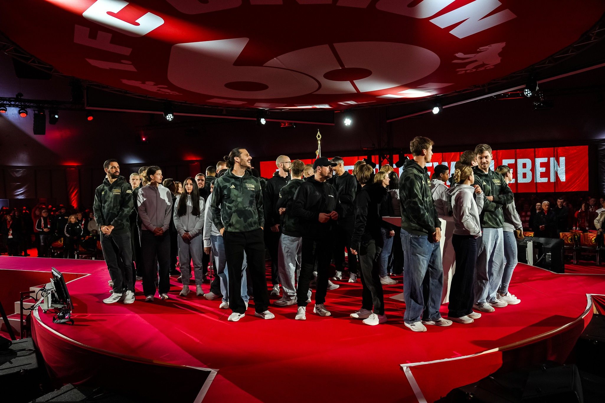Amidst loud cheers, the players of the two professional teams then entered the central round stage via four catwalks. In short interviews, women’s and men’s head coaches Ailien Poese and Steffen Baumgart summarised the current sporting situation of their teams. Afterwards, both squads took their seats in the tent, accompanied by loud Union chants from the audience.