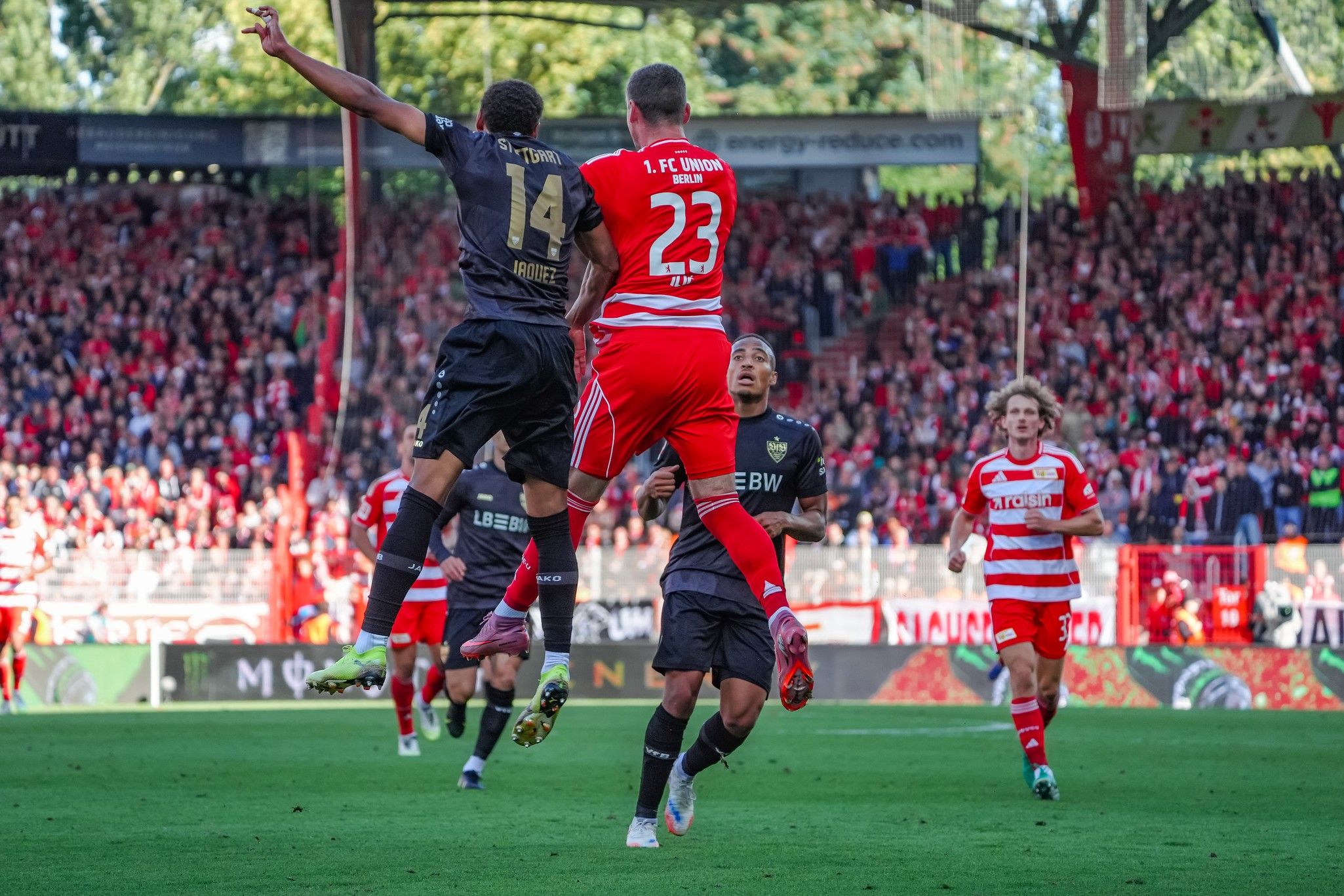 Mientras una enorme bandera con la imagen del portero ondeaba en las gradas del An der Alten Försterei y el confeti cubría el cielo de Köpenick, el Union tuvo su primera ocasión clara a balón parado. Tras un saque de esquina, Andrej Ilić ganó en el salto pero no logró imprimirle suficiente fuerza a su remate (9’). Poco después respondió el Stuttgart también a balón parado: un córner en corto terminó con un centro de Maximilian Mittelstädt que Jeff Chabot cabeceó con potencia. Sin embargo, Frederik Rönnow, recientemente elegido “futbolista del año del Union”, reaccionó a tiempo y desvió el balón por encima del larguero (12’).