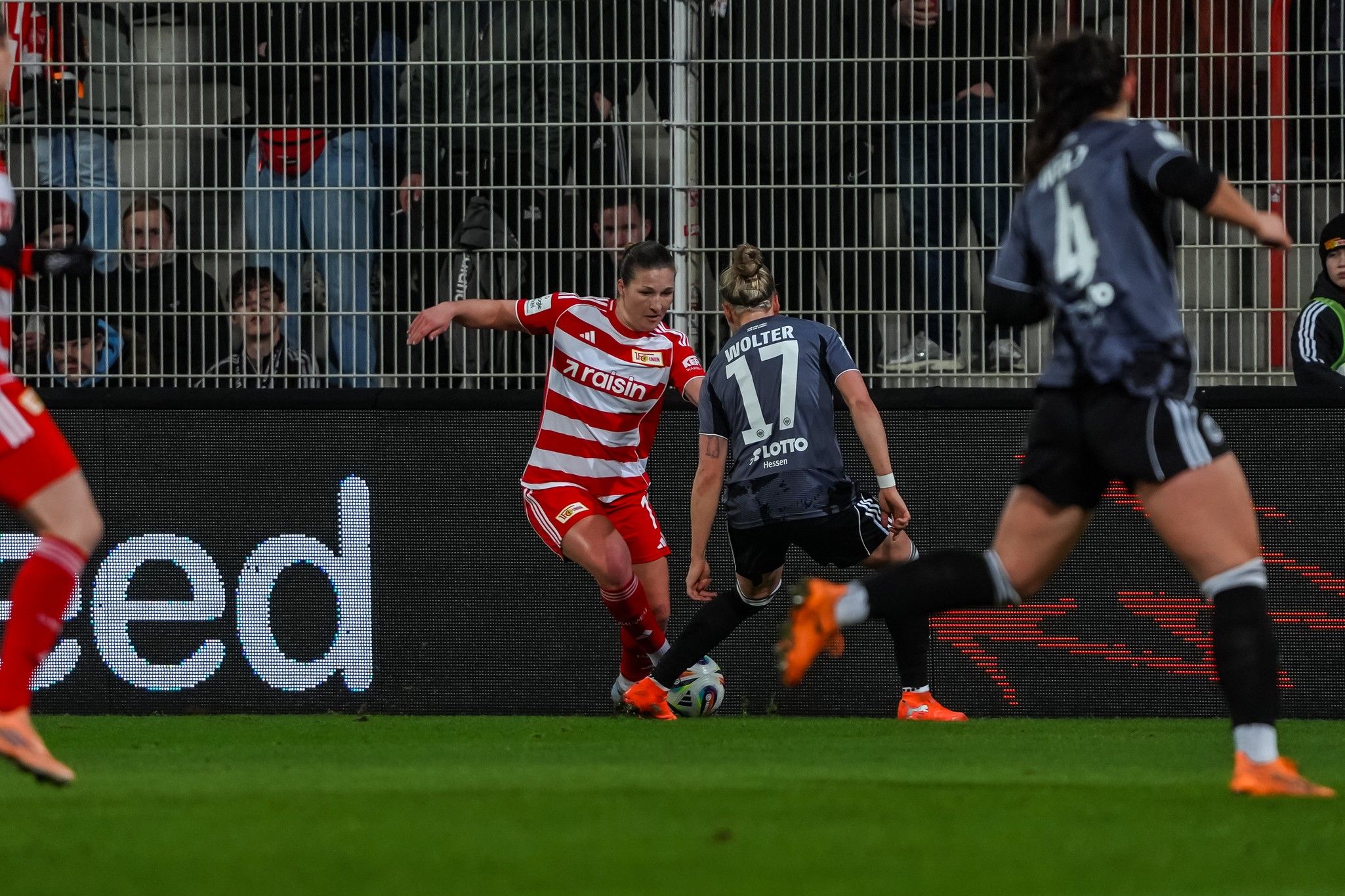 El último partido de la temporada en casa para las jugadoras del Union arrancó a un ritmo muy alto, con ocasiones para ambos equipos desde el inicio. Nicole Anyomi avisó pronto para el Eintracht, pero en el minuto dos falló desde corta distancia ante una atenta Cara Bösl. En el otro área, la guardameta visitante Lina Altenburg se impuso en el mano a mano a Sophie Weidauer (10’), en una acción precedida por un largo y preciso envío desde la defensa de Anna Weiß.